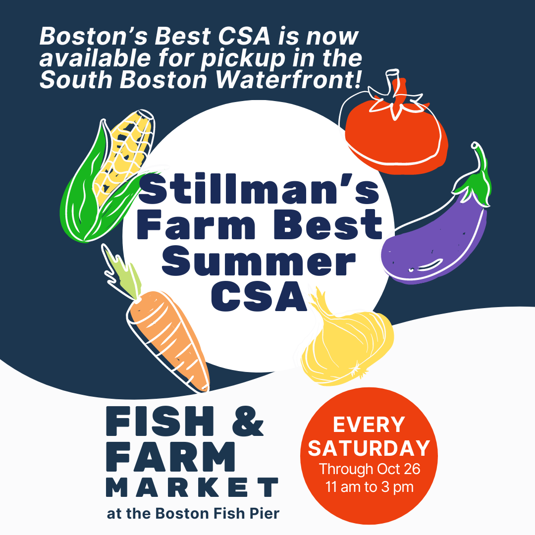 Stillman's Farm is excited to announce their new Saturday CSA in the South Boston Waterfront! Community-supported agriculture (CSA) links small farmers with consumers seeking fresh, seasonal produce. Sign up to receive a weekly bag of delicious produce from mid-June to early October. Stillman's Farm, named one of Boston’s Best CSAs, has served the community for 40 years. Their CSA supports sustainable farming and local agriculture. Your membership aids land stewardship, wildlife habitat, and donating excess produce to food pantries.They offer unique varieties not found in supermarkets (heirloom tomatoes anyone?) and include weekly newsletters with recipes and storage tips. Visit their farm, see where your food comes from, and enjoy a picnic on their beautiful grounds. Learn more about Stillman's CSA.