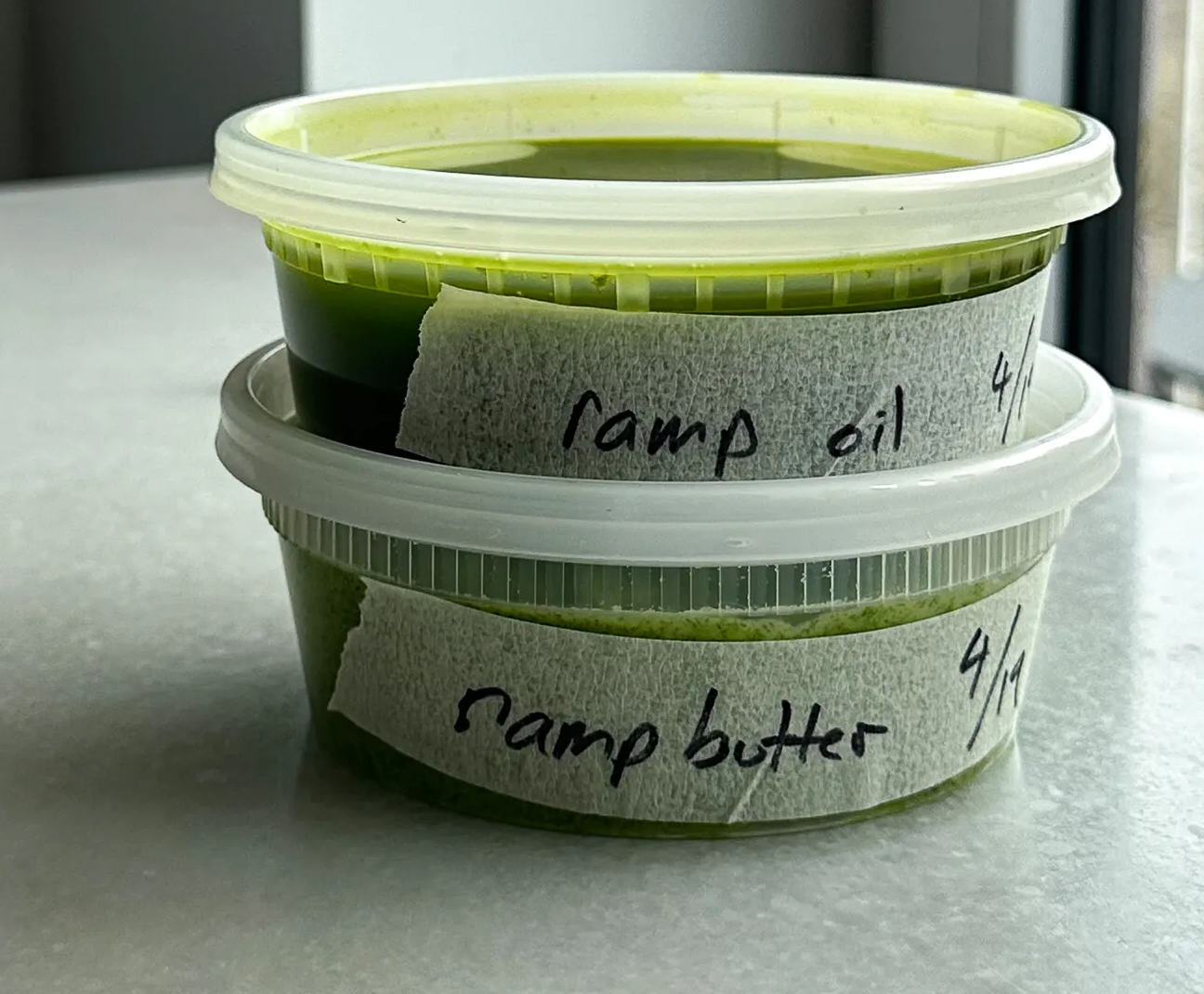 “These two recipes go together because without one, you'd be wasting a bit of the other! You'll see what I mean when you make it, but these ramp recipes are designed to give you all the flavor of your ramps, with none of the waste. Plus, once you have them on hand, they are just so versatile. Ramps are also known as Wild Garlic, and have a sweeter, roasted-garlicky flavor that is supremely good when used in an oil or compound butter. But don't worry, if you don't have ramps around you, this recipe also works with scallions, spring onions, spring garlic, or any tender herb you want to play around with.”