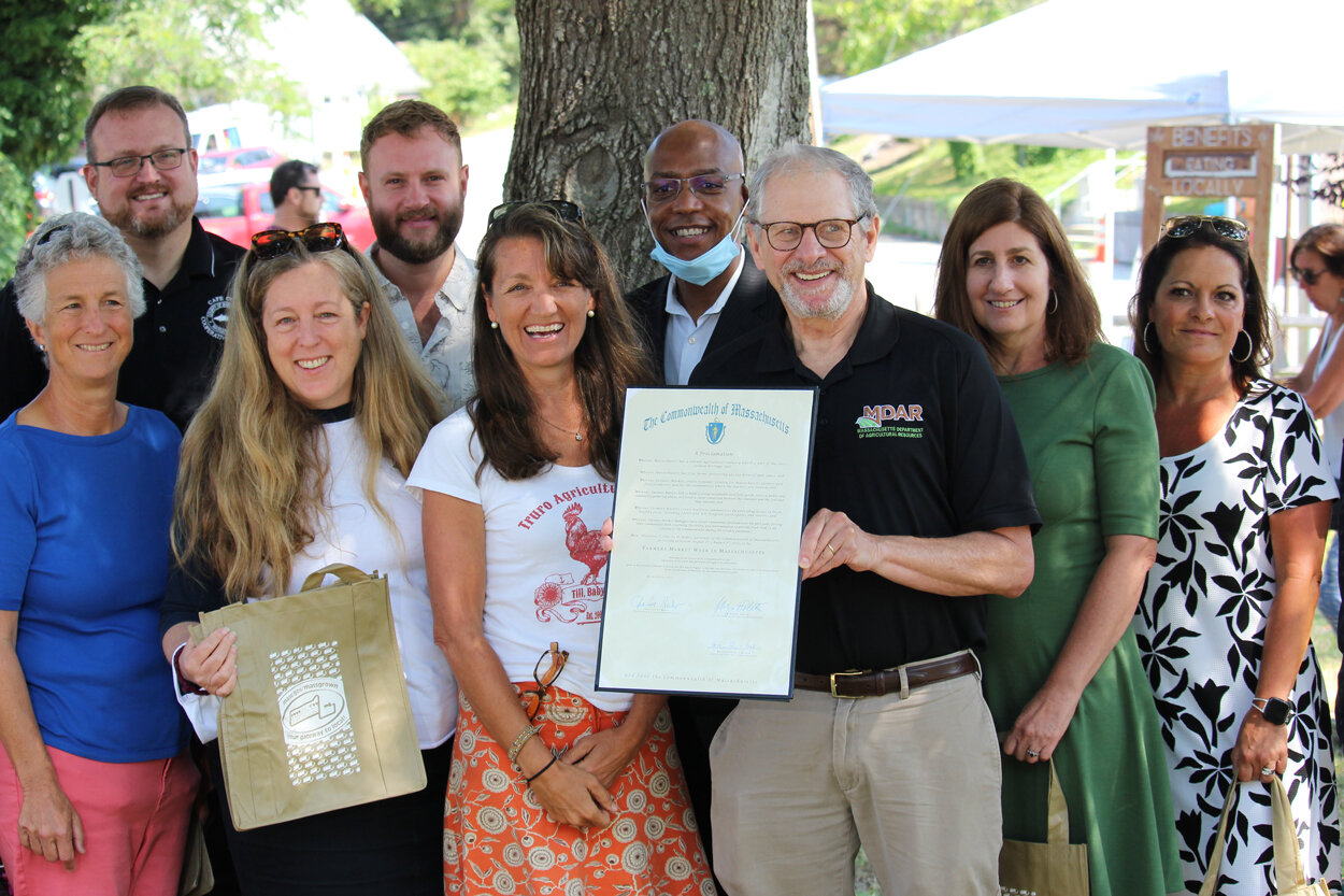 Massachusetts Department of Agricultural Resources Commissioner John Lebeaux joins State Representative Sarah Peake, Director of Cape Cod Extension Mike Maquire, State Senator Julian Cyr, Founding Director of Sustainable Cape Cod Francie Randolph, Northeast Regional Administrator for the USDA Food & Nutrition Service Lizbeth Silbermann, and Deputy Regional Administrator for the USDA Food & Nutrition Service Christine Ruggieri and Mass Farmers Market Executive Director Edith Murnane to celebrate Massachusetts Farmers Market Week in Truro. (Mass.gov)