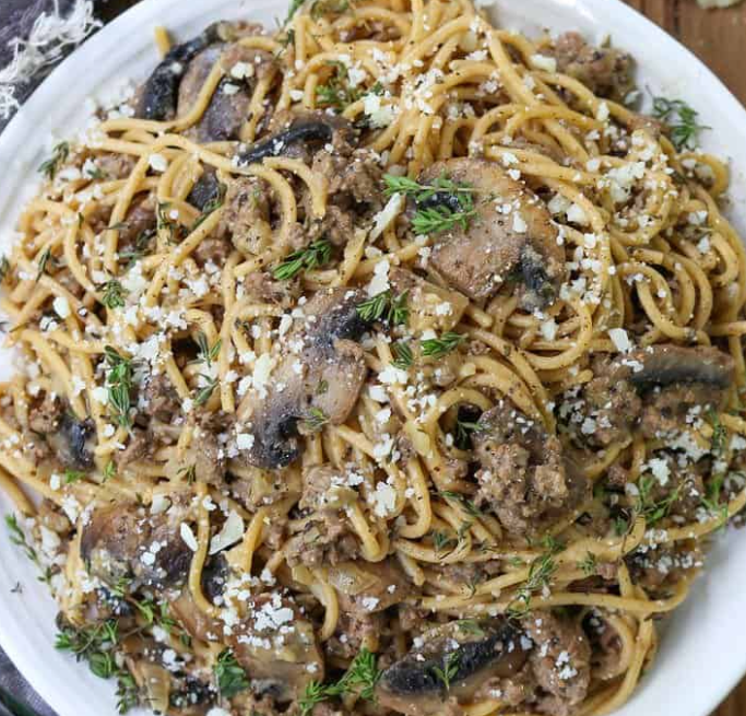 Saute onion, garlic, mushrooms, and ground beef. Saute until browned. Add chicken stock and wine, rosemary and thyme. Bring to a boil then turn the heat down and let liquid reduce by half.